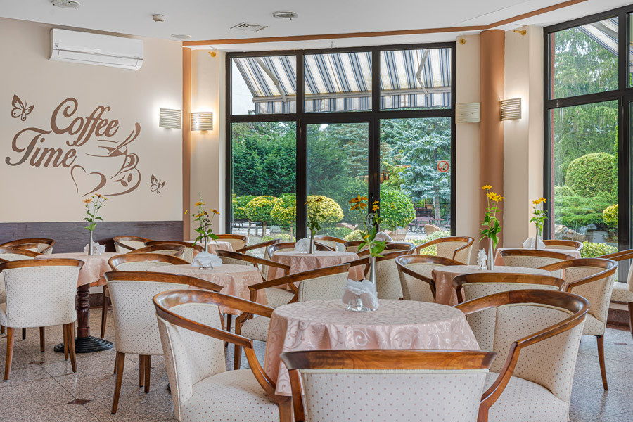 Kolejną atrakcją naszego obiektu jest elegancka kawiarnia, gdzie co wieczór odbywają się wieczorki taneczne. Oferujemy również całą gamę innych usług dostępnych dla Gości. Zapraszamy do Salonu Fryzjerskiego oraz do supernowocześnie wyposażonego Gabinetu Stomatologicznego. W cenę pobytu wliczone jest 45 minut korzystania z nowoczesnego basenu rehabilitacyjno-rekreacyjnego wraz z sauną fińską (suchą), łaźnią parową i jacuzzi.