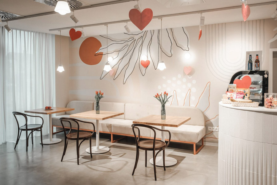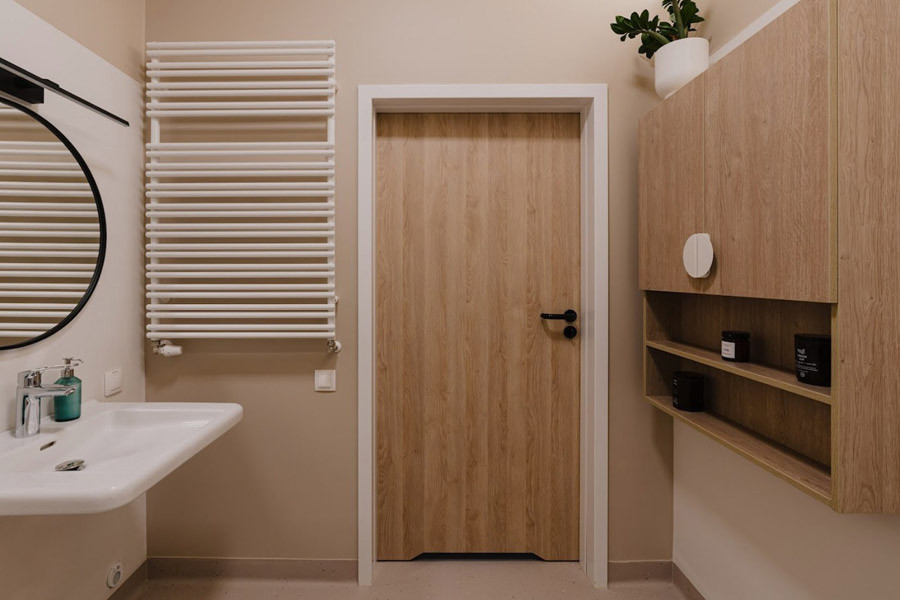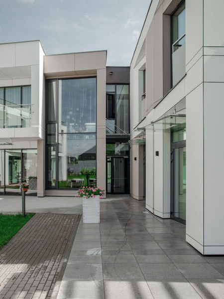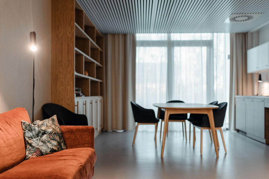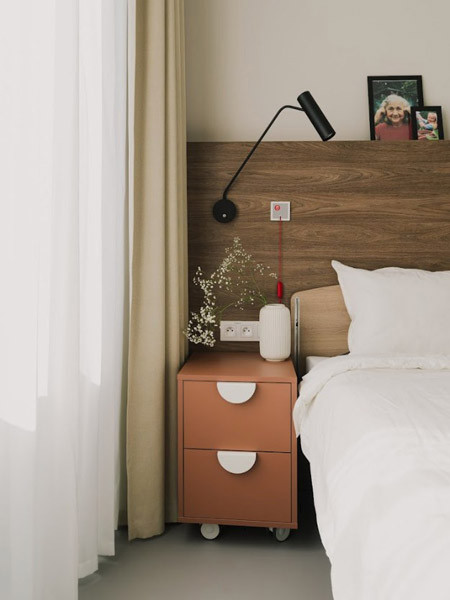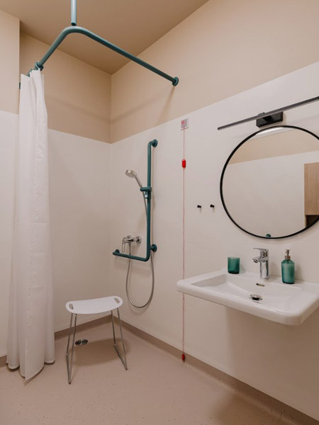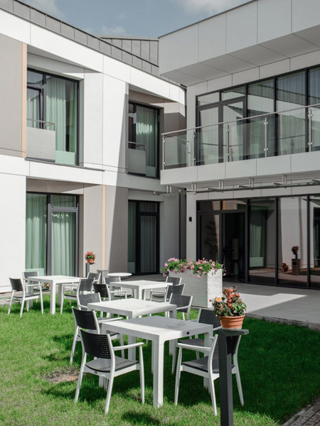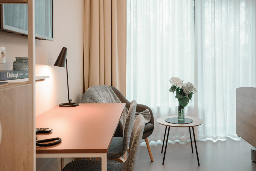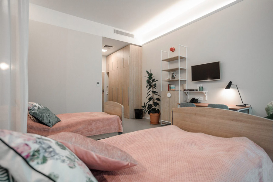 Komfortowe warunki pobytu: jasne i przytulne pokoje, w pełni dostosowane do potrzeb osób niepełnosprawnych, wyposażone w klimatyzację, windy oraz łóżka rehabilitacyjne