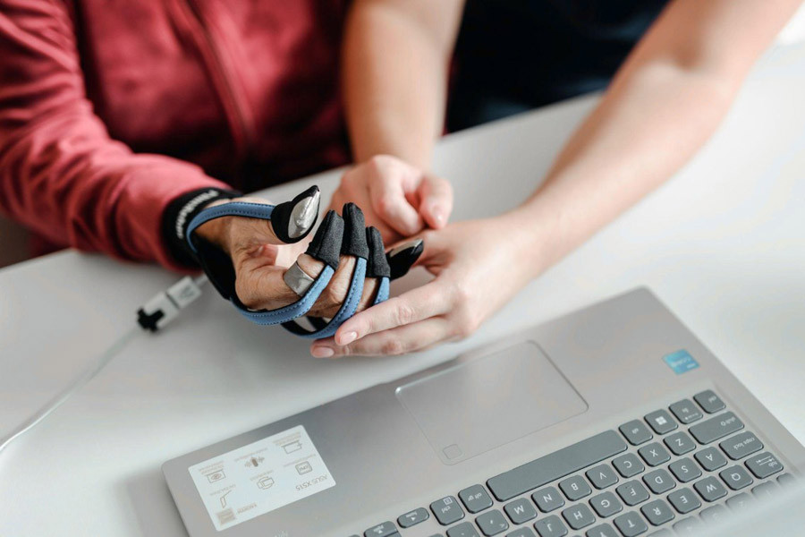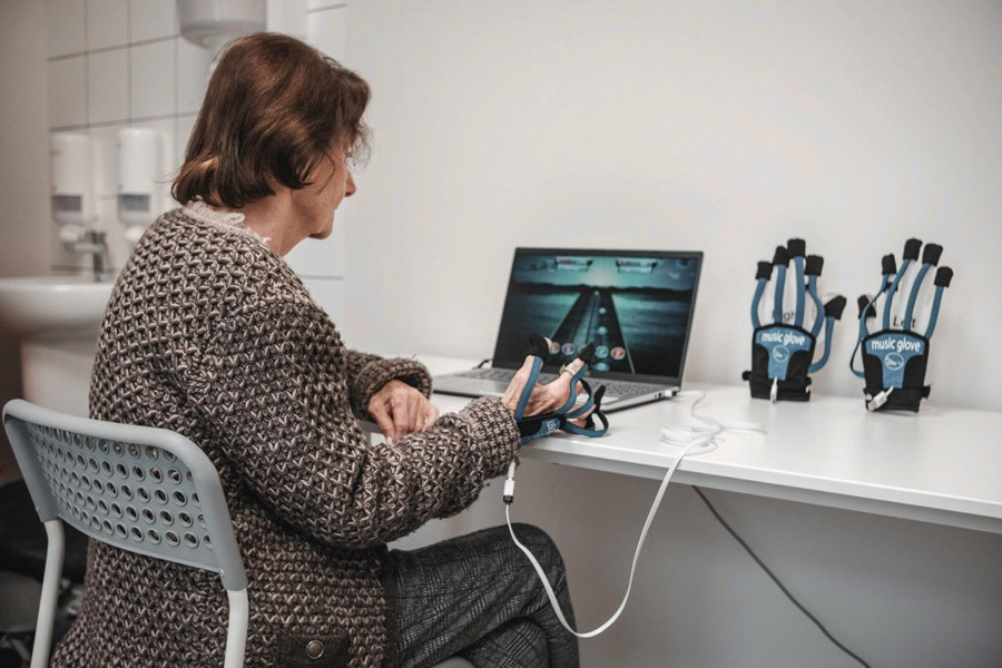 Rękawica Music Glove - Nowoczesne urządzenie do rehabilitacji dłoni po udarze i innych schorzeniach neurologicznych. Dzięki połączeniu muzyki, rytmu i elementów gry komputerowej urządzenie rejestruje postępy, co pozwala dopasować stopień trudności terapii do indywidualnych możliwości pacjenta.