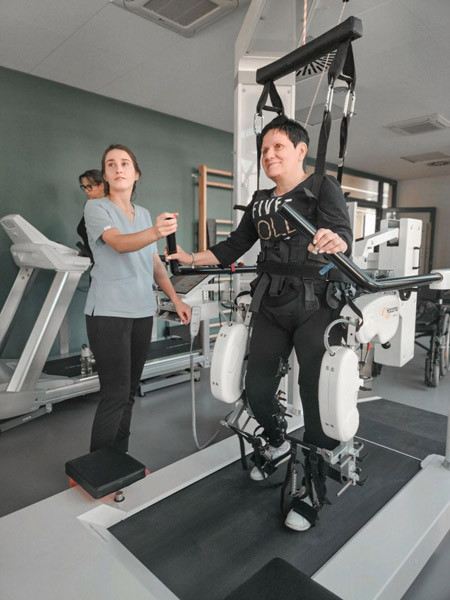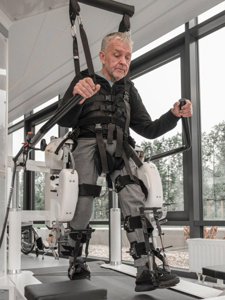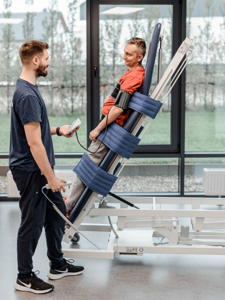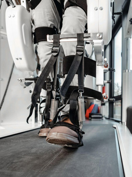 LOCOMAT - To zaawansowana, w pełni automatyczna orteza kończyn dolnych wspierająca rehabilitację chodu. Trening odbywa się na bieżni z dynamicznym odciążeniem, co pozwala zachować prawidłowy wzorzec ruchu nawet u pacjentów z dużymi ograniczeniami siły mięśniowej. Dzięki powtarzalnym ćwiczeniom pacjent wykonuje setki kroków w jednej sesji, co znacząco zwiększa efektywność terapii i przyspiesza naukę chodzenia. Regularna terapia pomaga w leczeniu zaburzeń chodu spowodowanych udarem mózgu, urazami, stwardnieniem rozsianym i innymi chorobami neurologicznymi.